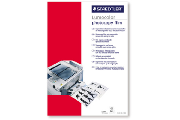• Photocopy film for use with almost all photocopiers • 0.10 mm, DIN A4 100 sheets per box Heat-resistant, backing sheet attached along the side, optical sheet detection. For b/w copier.