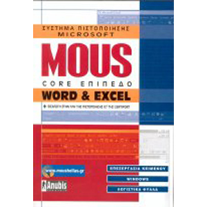 Συγγραφέας : Στέφανος Γκίκας, Μανώλης Παρούσης, Κώστας Γαβρίνας Σελίδες : 452 Οι εξετάσεις MOUS (Microsoft Office User Specialist) τυγχάνουν της γενικής αναγνώρισης στην αγορά εργασί ας, επειδή πιστοποιούν με αντικειμενικά κριτήρια ότι ο κάτοχος του σχετικού τίτλου είναι ικανός να εφαρμόζει πρακτικά τις γνώσεις του, και μάλιστα υπό πίεση χρόνου . Το βιβλίο καλύπτει πλήρως, σε επίπεδο Core, την ύλη των εξετάσεων MOUS για το Word και το Excel. Διάρθρωση των κεφαλαίων με στόχο την ενσωμάτωση της ύλης MOUS μέσα στο γενικότε ρο πλαίσιο της ύλης του IC3. 250 ερωτήσεις για να ελέγξετε τις γνώσεις σας! Κατανεμημένες σε κάθε κεφάλαιο, είναι το αλάνθαστο «βαρόμετρο» για να εκτιμήσετε την πρόοδό σας και να εμπεδώσετε την ύλη κάθε κεφαλαίου. 200 ασκήσεις, εστιασμένες στην ύλη κάθε κεφαλαίου, για να εφαρμόσετε αυτά που διαβάσατε! Βήμα προς βήμα οδηγοί, σε ειδικά ένθετα πλαίσια! Ακολουθήστε τα αριθμημένα βήματα των οδηγών για γρήγορα αποτελέσματα. Πολλές συμβουλές που συμπληρώνουν το βασικό κείμενο και λύνουν απορίες. Κατά λογος καλυπτόμενων θεμάτων στην αρχή κάθε κεφαλαίου, για να γνωρίζετε από την αρχή τι περιέχει κάθε κεφάλαιο. Περιλαμβάνεται εισαγωγή στην ύλη της πιστοποίησης IC3 τ ης Certiport.Prices, Promotions, Specifications, Availability and Offers may change without any notice. Pricing, typographic, or photographic errors may occur.