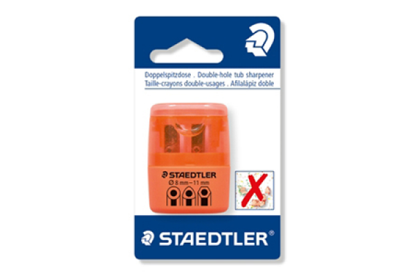 STAEDTLER double-hole tub sharpener neon orange blistercardPrices, Promotions, Specifications, Availability and Offers may change without any notice. Pricing, typographic, or photographic errors may occur.